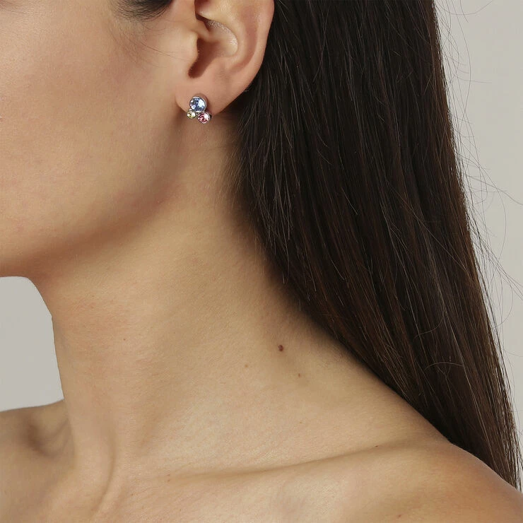 AKI er en sød lille ørering. Designet er en lille trio af skinnende facetslebne krystaller i forskellige størrelser. Anvend den alene eller som din anden piercing – som en interessant og personlig styling. Håndlavet i guldtonet messing med en lås i kirurgisk stål. Her vist i moderigtig kombination af 3 pastelfarvde krystaller og guldtonet metal. Nikkelfri dansk design.