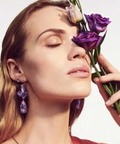 AMY – en super cool og trendy ørenring der virkelig står frem med sine tre handfacetterede stenkrystaller og en vidunderlig hængende dråbe ørenringen er håndlavet i poleret messing med en teknisk forgyldning, der bare holder. Her vist i smukkeste lavendelblå toner. Ørenringen er forsynet med en stikker i kirurgisk stål. Dansk design fra DYRBERG/KERN, naturligvis håndlavet, nikkelfri og allergistestet.
