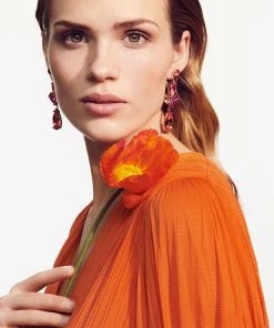 AMY – en super cool og trendy ørenring der virkelig står frem med sine tre handfacetterede stenkrystaller og en vidunderlig hængende dråbe ørenringen er håndlavet i poleret messing med en teknisk forgyldning, der bare holder. Her vist i smukkeste koral/pink toner. Ørenringen er forsynet med en stikker i kirurgisk stål. Dansk design fra DYRBERG/KERN, naturligvis, håndlavet, nikkelfri og allergistestet.