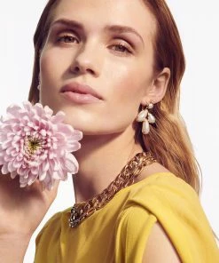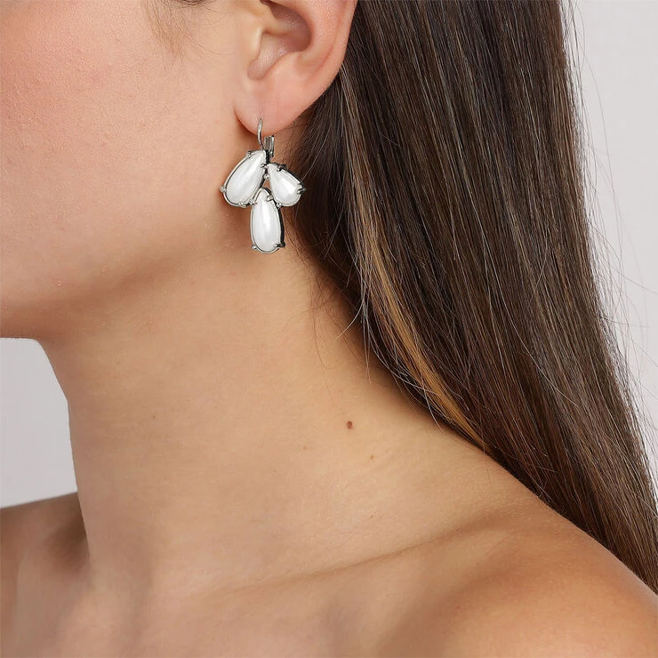 AUBIN – een af vores smukkeste styles, der virkelig står ud. Vi har lavet AUBIN i flere farvevarianter – her er tre liljehvide dråbeformede perleimitationer er sat ned i en sølvtonet fatning skabt i messing. Den franske lås er produceret i kirurgisk stål. Smykket er håndlavet, dansk design, naturligvis nikkelfrit og allergitestet. Smuk til alt fra en sweatshirt til dig der skal giftes.