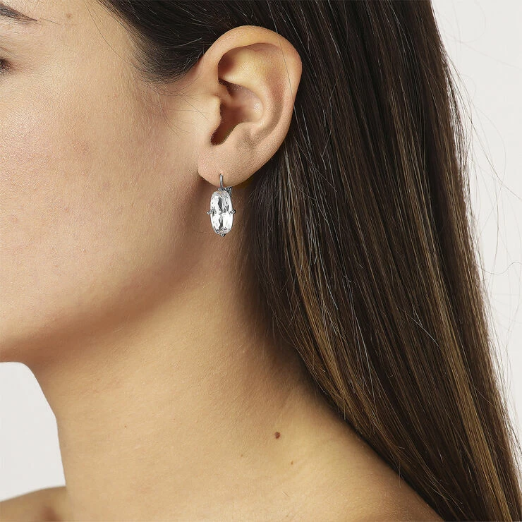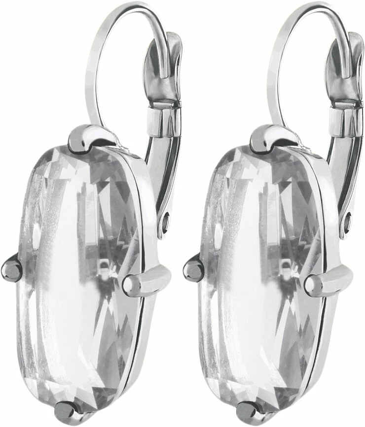 BARITA: Denne ørenring med sin smukke oversized rektangulære facetslebne krystal med rundede hjørner er smuk i al sin enkelhed. Her vist i en sølvtonet version og klassisk diamantlignende hvid krystal. Låsen er en fransk hook, som vi kalder den. Materialet er messing med en kvalitetsbelægning, der bare holder.Dansk design, fra DYRBERG KERN – og naturligvis allergitestet og nikkelfri.