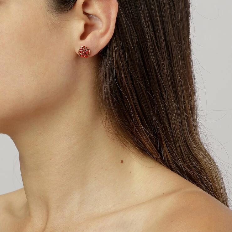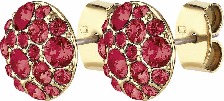 BLAIS – denne lille men yderst interresante ørenstikker er smukt dekoreret med Swarovski krystaller håndsat tone i tone i varierende størrelser. Brug den med BARLETTE kæden der passer perfekt til. Brug BLAIS alene, eller hvis du har flere huller i ørene er den osse smuk i andet hul. ca 1,2 cm i diameter. Smykket er håndlavet i messing, skabt i poleret messing med en meget holdbar belægning, her vist i gylden finish med røde krystaller. Stikkeren er lavet i kirurgisk stål. Dansk design, håndlavet, nikkelfri og allergistestet .