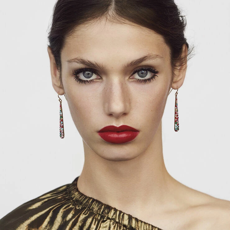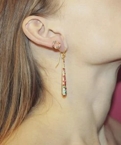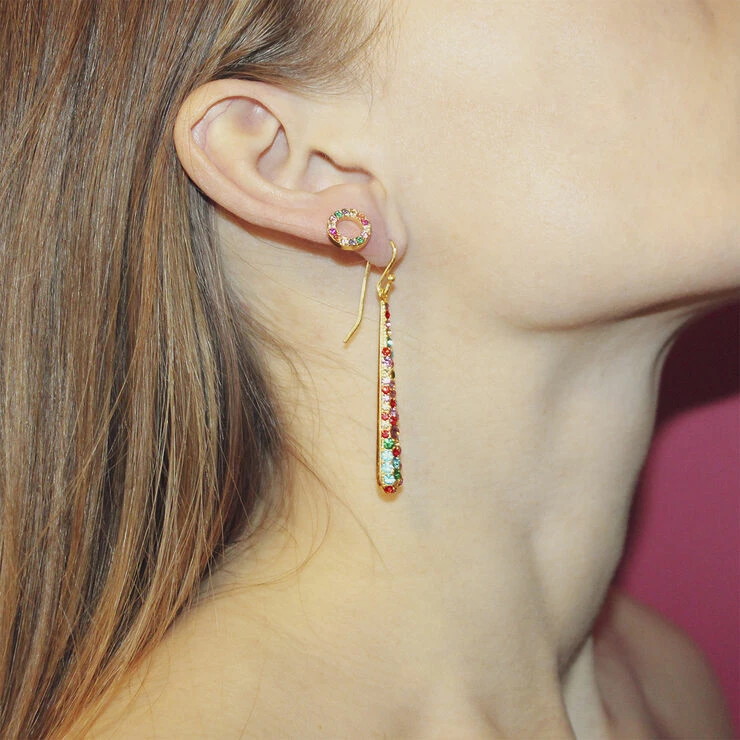 Elegant aflang dråbeformet ørering i guldtonet finish med multifarvede krystaller. Nikkelfri.