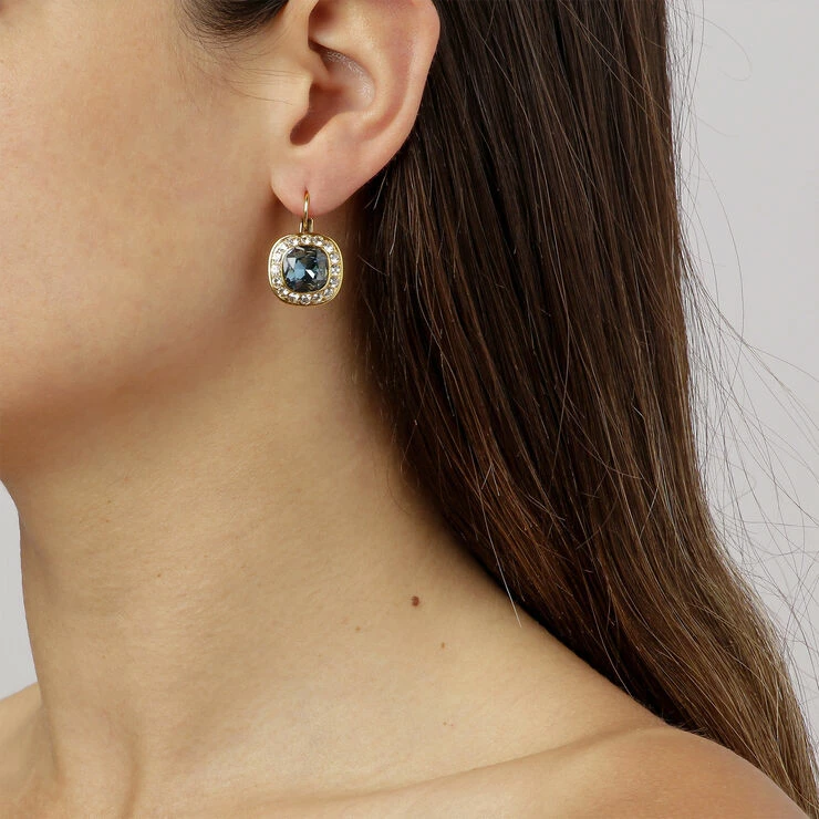 CELIN – en meget spændende og nytænkt dog klassisk ørenring, der virkelig står frem ved det at stensætningen er så spændende.Ørenkrogen er produceret i kirurgisk stål, mens selve smykkets materiale er messing der har fået en meget holdbar plattering / belægning. CELIN, der er dansk design, allergistestet og nikkelfri er naturligvis designet af DYRBERG KERN og her vist i smukke kongeblå og gyldne krystaller på en guldtonet baggrund.