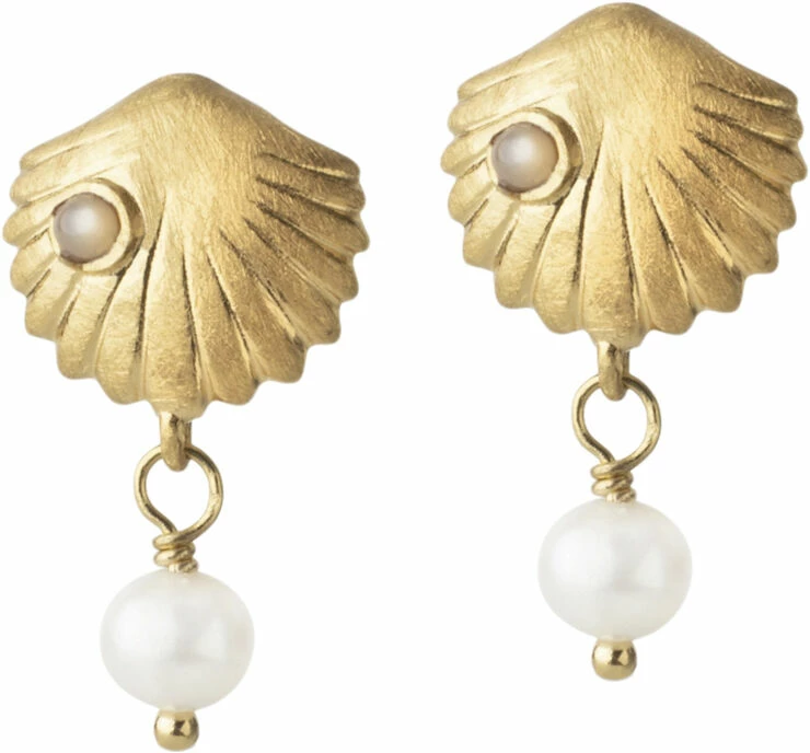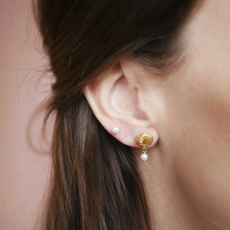 Om smykket:Bay scallop ørestikker er en fin lille muslingeskal med en indfattet perlemor og hvide ferskvandsperler. Kan bruges alene eller kombineres med andre af vores øreringe.