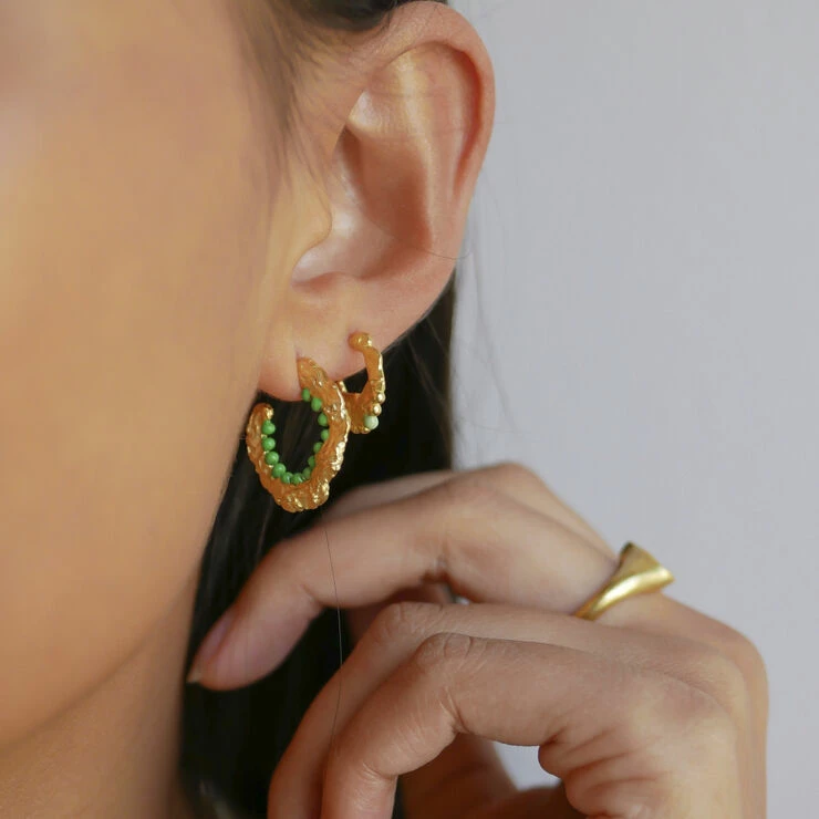 Bemærk- Prisen er pr. par Om smykket- Vores skønne Enora hoops er virkelig i en klasse for sig. Forfra ligner den en cool, rå hoop, der fylder godt på øret. Men ser du den fra siden er der placeret emaljekulger på indersiden i den skønneste grønne emaljefarve. Enora øreringene er et elegant statement piece der uden tvivl kommer til at skille sig ud blandt dine andre smykker.