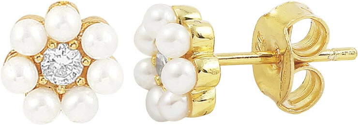 Sterling sølv forgyldt med 18 karat guld, cubic zirconia og ferskvandsperler. Diameter: 0.7 cm
