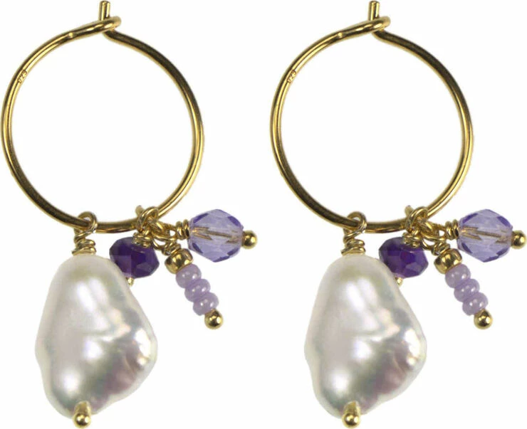 Hoop earring. 18K gold plated sterling silver with coloured glass beads and freshwater pearls. Length: 3 cm