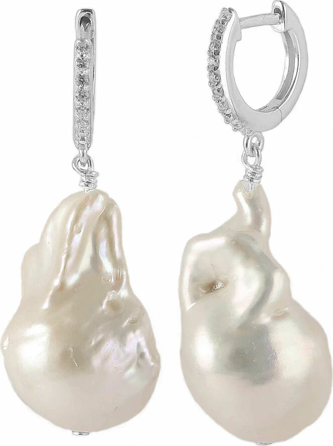 Hoop earring. Sterling silver with white cubic zirconia and a white baroque freshwater pearl. Length: 3.5 cm
