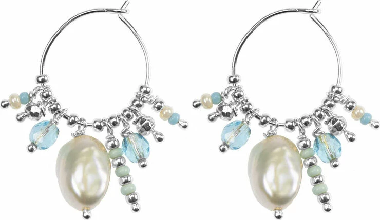 Hoop earring. Sterling silver with coloured glass beads and freshwater pearls. Length: 3.5 cm