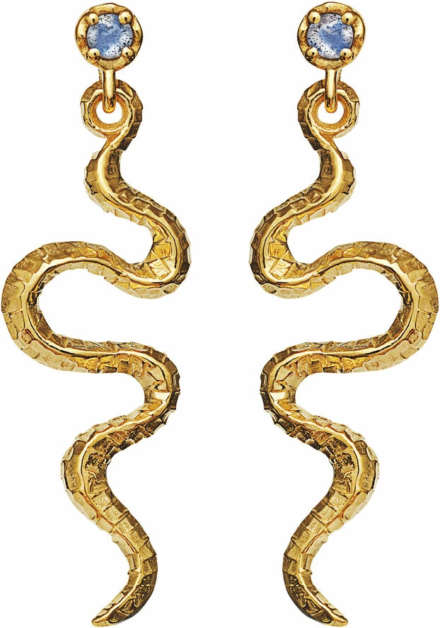 Unik slangeform indfattet med en ægte facetteret labradorit i ørestikken. Længde: 2,7 cm Materiale: Sterlingsølv (925), belagt med 18 karat guld, labradorit.