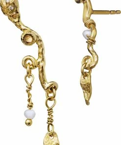 Elegance omkranser underspillede skatte i form af glimtende detaljer og skiftende overflader. Øreringene spirer som spinkle, små grene, der munder ud i sarte guldblade. De prydes af en pink turmalin og ferskvandsperler, der siges at forbinde os til den naturlige verden.<br><br>Maanestens SS22 kollektion er inspireret af alle de organiske former, der findes omkring os, og de kreative energier, de giver beskueren. Kollektionen, Surrounding Shapes, hylder håndværket og er som alle Maanestens smykker håndlavet på eget værkssted i Jaipur, Indien.<br><br>Materialer: genanvendt sterling sølv (925) belagt med 18karat guld, pink turmalin, ferskvandsperler, champagne zirkonia<br><br>Længde: 40 mm og 29 mm