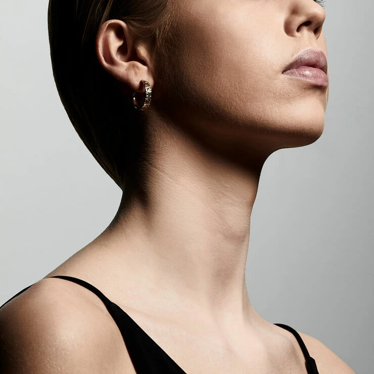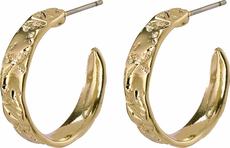 Henrivende, guldbelagte øreringe med tekstureret overflade fra Compassion-kollektionen. Øreringene minder om et par klassiske hoops, men den teksturerede og rå overflade tilfører øreringene en kraftfuld energi. Kombinationen af ringenes bløde form og den smukt formede afslutning på ringen, som danner en lille pil, skaber et cool og stærkt udtryk, som kan matche ethvert outfit, når du bevæger dig ud i hverdagen og weekenderne.