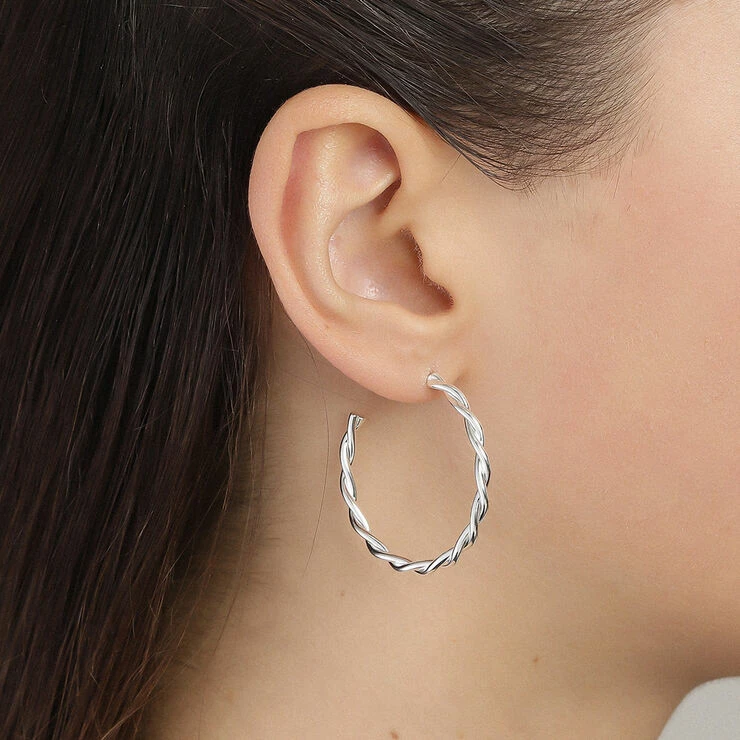 Smukke sølvbelagte hoops med en smukt snoet ring. En lækker variation over de klassiske creoler. Snoningerne giver en smuk refleksion af lyset i de sølvbelagte ringe. Vores snoede hoops fås i tre størrelser, så du kan finde dem, der passer til dig og dit unikke look. Disse er i mediumstørrelsen. Et par øreringe, der hurtigt vil blive en favorit. Brug dem alene eller i kombination med andre af Pilgrims skønne øreringe.