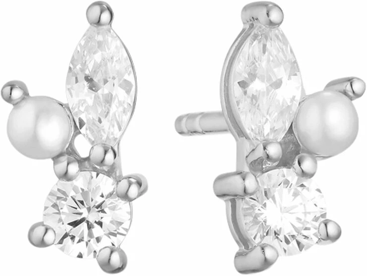 Øreringe i rhodineret sterlingsølv 925, håndsat med facetslebet hvide zirkoner og skinnende ferskvandsperle.