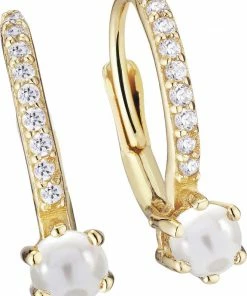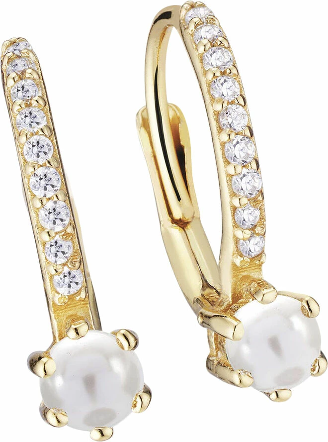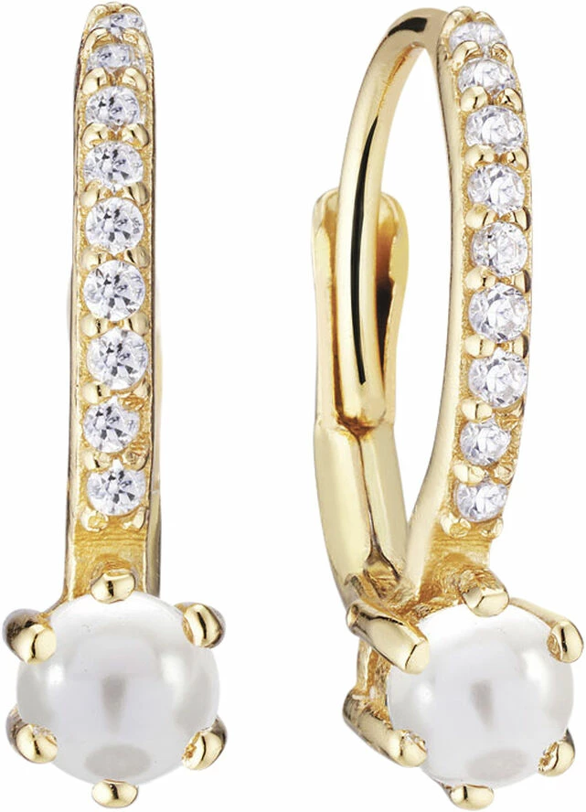 Sif Jakobs Jewellery Rimini-kollektionen præsenterer smukt sarte, klassiske pieces med farver og spændende sparklende cubic zirconia-former. Rimini er den perfekte balance mellem nye klassikere og lige på trend pieces. French hook øreringe i sterlingsølv 925 forgyldt med 18 karat guld med blankpoleret overflade, håndsat med facetslebne 1 mm hvide zirkoner og 3,3 mm ferskvandsperle.<br>Øreringenes mål: Længde 15 mm, Bredde 0,9 mm, Tykkelse 0,9 mm