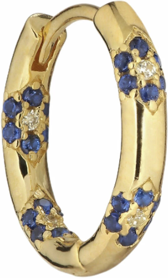 Huggie ørering med små blomster med sten i farverne safir og lys gul. Sælges enkeltvis.