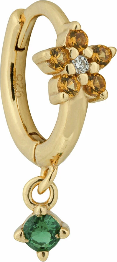 Huggie ørering med fin blomst. Sten i farverne orange, smaragd og klar. Sælges enkeltvis.